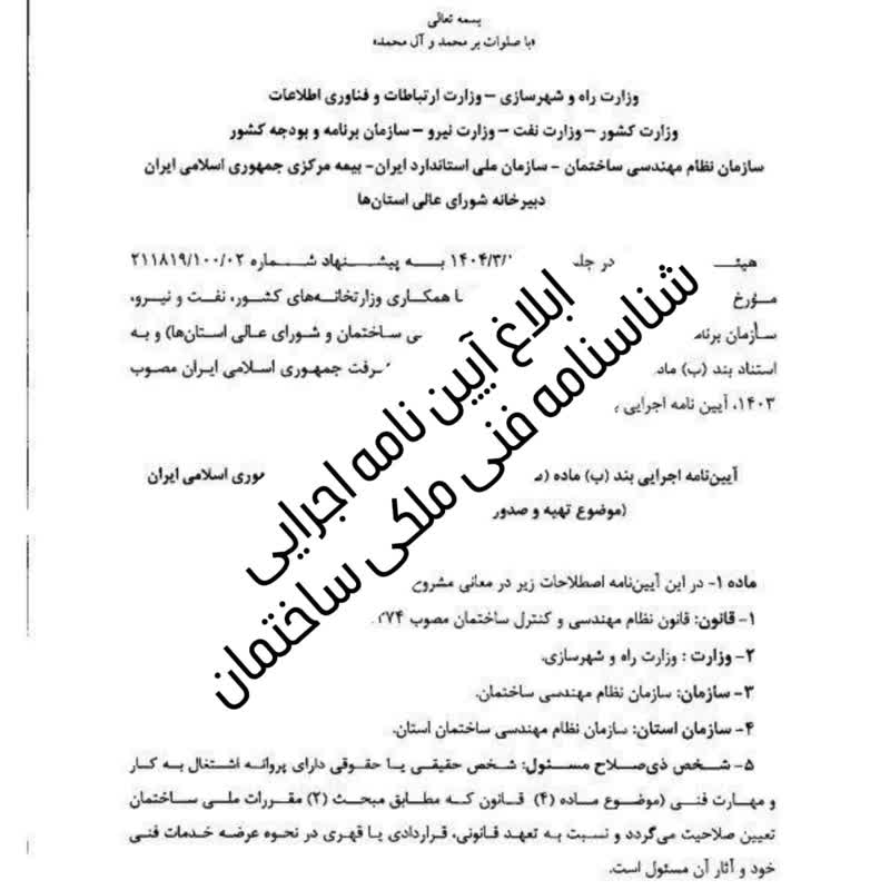 آغاز فصل نوین در ساخت‌وساز کشور با محوریت مهندسان ساختمان و صدور شناسنامه فنی ملکی با تصویب آیین‌نامه اجرایی بند ب ماده ۵۵ برنامه هفتم توسعه در کمیسیون زیربنایی هیئت دولت، گام مهمی برای اجرای شناسنامه فنی-ملکی ساختمان برداشته شد. این آیین‌نامه، نقطه عطفی در جهت صیانت از حقوق بهره‌برداران و ارتقای کیفیت ساخت‌وساز با تکیه بر دانش و مسئولیت مهندسان ذی‌صلاح است. 🔍 این شناسنامه شامل موارد زیر خواهد بود: • اطلاعات فنی ملک • مشخصات ثبتی و مالکیتی • اطلاعات مهندسان و ناظران ذی‌صلاح ✨ وجه تمایز این آیین‌نامه چیست؟ • ورود رسمی بیمه‌ها به حوزه تضمین کیفیت ساخت • تعریف نقش اجرایی برای سازمان ملی استاندارد • تمرکز بر بهینه‌سازی مصرف انرژی و کاهش مصرف آب • الزام به ثبت و پیگیری تمام اطلاعات به‌صورت الکترونیکی و برخط 📅 این آیین‌نامه از اول تیر ۱۴۰۴ لازم‌الاجراست و به نهادهای مرتبط از جمله وزارت راه‌وشهرسازی، سازمان برنامه و بودجه، بیمه مرکزی، و سازمان نظام مهندسی ساختمان ابلاغ شده است. 🎯 آینده‌ای شفاف، ایمن و هوشمند در صنعت ساخت‌وساز، با محوریت مهندسان مسئولیت‌پذیر و متخصص در راه است. #مهدی_روانشاد‌نیا #نظام_مهندسی #شناسنامه_فنی_ملکی #مهندس_ذی‌صلاح #کیفیت_ساخت #ساخت_وساز_ایمن #بیمه_ساختمان #مصرف_بهینه #بهره‌وری_انرژی #ساختمان_پایدار #استاندارد_ملی #برنامه_هفتم #مهندسی_نوین #تحول_دیجیتال #حقوق_بهره‌برداران #سند_ملکی_هوشمند